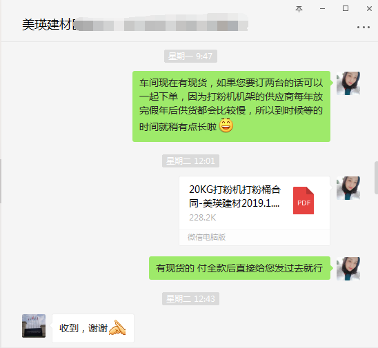 此次已經是博昌建材粉末打粉機廠家第二次與美瑛合作,直接微信溝通確認好有現貨就直接下訂單了!