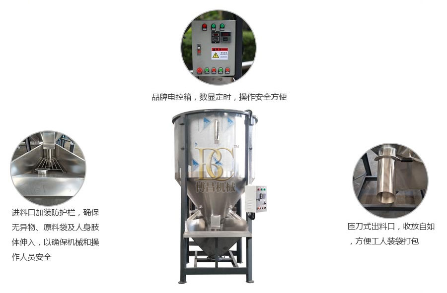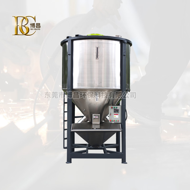 立式攪拌機采用螺旋攪拌式作之原理,將投入投料斗中的物料通過螺旋主軸輸送到桶體上端,再以傘狀形落下且一直持續循環攪拌,從而達到混合均勻的目的。廣泛應用于:塑膠粒料、粉碎料、塑膠造料、塑膠片料、塑膠新舊料及添加色母攪拌均化等用途。